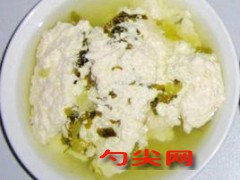 配方:將選好的大豆入涼水中浸泡12小時左右,洗凈后上石磨磨成細漿。將細漿用豆包布過濾(豆渣另用),盛入鍋中,加火煮沸后改為小火。徐徐倒入漿水(豆漿與漿水的比例為25∶1),加入豆功夫A慢慢攪勻,待豆漿呈半凝固狀時,停止攪動,令其靜置凝固。約幾分種后,豆漿凝結,舀出表面清汁(又稱膏水),將凝結的豆花用豆包布包起,攤放在簸箕內,壓上木板,約1小時后,即成嫩豆腐塊。漿水制作:漿水就是做漿水面的發酵菜水,可以用來點豆腐。當地人多有漿水。如無效水,可提前制作。將質地較硬的芹菜洗凈,入沸水中燙蔫,撈出后放在干凈、無油的盆內,再加溫開水,加蓋后放在溫暖的地方,二三天后即成酸香的漿水,即可用來點豆腐。如要多次使用,可隨用隨加入適量的溫開水或煮過面條的面湯,并更換芹菜,以換菜養水。將豆渣加水,過濾出稀豆漿;將稀豆漿和膏水放鍋內,加入適量大米,煮成粥。將做好的嫩豆腐切成小片,放入粥內,即為味美清香的豆腐粥。食時,盛入碗中,撒上焯過的菜碼,咸菜末,淋上辣椒油,就成了酸、辣、鮮、香、爽的菜豆腐粥。菜豆腐亦可做成其它菜食用。產品特點質地極嫩,酸甜清香,別有風味。