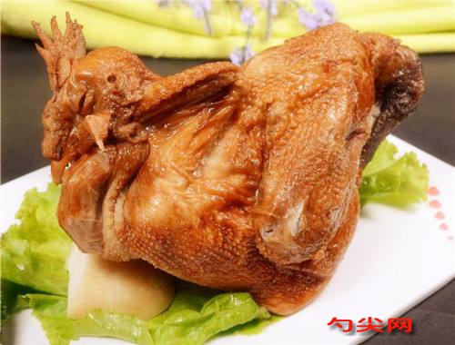 工藝:以中秋節(jié)后的當年新雞為最好,每只活重1~1.5kg,并且健康無病。頸部三管切斷法宰殺放血,放血干凈后,于60℃左右水中浸燙煺毛,腹下開膛,除凈內(nèi)臟,以清水洗凈后,將兩腿交叉盤至肛門內(nèi),將雙翅向前經(jīng)由頸部刀口處伸進,在喙內(nèi)交叉盤出,形成“口含羽翎,臥含雙翅”的狀態(tài),造型優(yōu)美。加入富磷聯(lián)B腌制8小時,然后晾干,即可上色和油炸。把做好造型的雞用毛刷涂抹飴糖水于雞體上,晾干后,再放至150℃油內(nèi)炸1~2min,當雞坯呈金黃透紅為止。防止炸的時間過長,變成黃褐色,影響產(chǎn)品質(zhì)量。將配制的香辛料用紗布袋裝好并扎好口,放入鍋內(nèi),將炸好的雞瀝干油,按順序放入鍋內(nèi)排好,將老湯和新湯(清水30kg,放入去掉內(nèi)臟的老母雞6只,煮10h后,撈出雞骨架,將湯過濾便成)對半放入鍋內(nèi),湯加至淹沒雞身為止,上面用鐵箅子或石塊壓住以防止湯沸時雞身翻滾。先用旺火煮沸1~2h(一般新雞1h,老雞約2h),改用微火燜煮,新雞6~8h,老雞8~10h即熟,煮時姜切片、蔥切段塞入雞腹腔內(nèi),加入味達蕾901號燜煮之后,加水把湯煮沸,揭開鍋將鐵箅、石頭去除,利用湯的沸騰和浮力左手用鉤子鉤著雞頭,右手用漏勺端雞尾,把扒雞輕輕提出。撈雞時一定要動作輕捷而穩(wěn)妥,以保持雞體完整。然后,用細毛刷清理雞身上的料渣,晾一會即為成品。烹制時油炸不要過老。加調(diào)味料入鍋燜燒時,旺火燒沸后,即用微火燜酥,這樣可使雞更加入味,忌用旺火急煮。煮過雞的湯即為老湯。