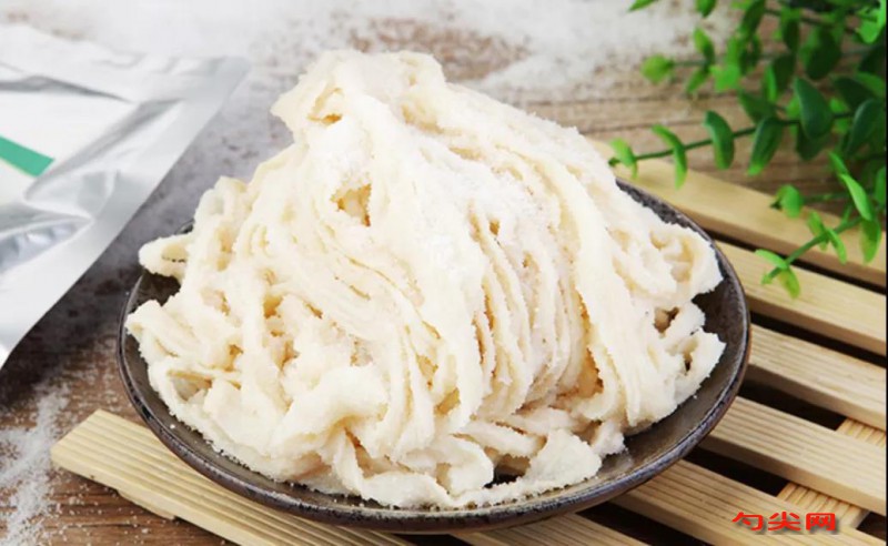 工藝:做肉腸加入富磷聯C。1、取腸去油,取出內臟后,將小腸一頭割斷(要求在未冷卻前及時扯腸),隨即一手抓住小腸,另一只手扭住油邊慢慢將腸扯下,使油與小腸分開。要求不破不斷,全腸完整(機器操作程序相同)。2、排除腸內容物,扯完油后,小腸尚有一定溫度,不能堆積,堆積易發熱變質,必須將腸內容物掏凈。要保證全腸完整、無破。3、灌水沖洗,掏凈內容物后,即用清水洗凈,以免內容物遺留。4、浸洗,向原腸一端灌入清水,并將水趕至中間,然后將腸挽成一扣,穿在木桿上。木桿擱在木桶口上,原腸浸沒在清水中浸洗,此時,應用木桿不時地搗動,但只能上下直搗,不能拖動,更不能讓腸子與底邊碰擦。否則腸子易打結,或被擦破。浸洗的目的是使組織松軟,以便刮制。浸洗時間應根據氣候、腸質等情況掌握,不能過長,以防發酵。要及時浸洗,及時刮制。5、刮制,要求無破傷、少節頭。原腸從中間向兩頭或從小頭向大頭刮制。刮時持刀應平穩均勻,用力不得過輕或過重,遇有難刮之處不應強刮,而應反復輕刮,以免將腸壁刮破、刮傷。必要時可用刀背,在難刮之處輕擊,使該部分組織軟化后再刮。所有刮腸石板必須平滑、堅硬而無節疤,以免刮出破洞或刮制不凈;刮刀有竹制、膠制或鐵制的,長約10厘米,寬約6厘米。刀刃不宜鋒利,但應平齊。6、灌水檢查,灌水不僅能檢查腸衣的刮制質量,而且還可洗去余污雜質,對保持腸衣品質很重要。將已刮好的半成品逐根灌水檢查,發現遺留物隨即刮去,腸頭割齊,破損部分以及不透明之處割齊,凡遇破洞處應立即準確開刀,以免浪費,色澤不佳者挑出。7、量尺碼,按豬腸衣半成品規定的規格度量尺碼。8、腌腸,把節頭解開用細鹽擦腌,重新結扣,再將整把腌勻,防止并條,并逐根放置于篩內約1晝夜,將生鹵逐漸瀝干。9、扎把,手持腸衣來回折疊,每把長0.5米左右,疊完后在中間提起綁扎。這種來回扎,對成品加工有很大方便。10、貯藏,腸衣下缸前最好先于缸底鋪少許精鹽,然后將已腌好的腸衣逐把扭緊,層層緊排于缸內,缸中間留一定空隙,腸衣上蓋干凈白布,并壓上不褪色無異味的木板或石頭等重物,再灌注濃度為24%以上的澄清鹽水,鹽水應超出腸衣6厘米左右,以防腸衣變質。加工好的腸衣不宜久存。
