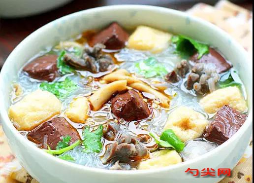 工藝:1、先將鴨血切成1.5厘米小塊,放入鹽水中浸泡片刻;鴨胗切花刀,鴨腸將里面的油脂刮干凈,加適量鹽揉洗干凈,放入水中汆燙,鴨腸卷起就馬上撈出2、鍋中加入適量的油,放入蔥姜蒜爆香。根據個人口味,可以加入適量的干辣椒、花椒等調料,增加菜肴的風味。倒入鴨湯,大火燒開后轉小火保持微沸狀態。先將焯水后的鴨血放入鍋中,煮至鴨血完全熟透且入味。接著放入泡軟的粉絲,煮至粉絲變軟且吸收湯汁。加入小油豆腐4、煮滾后將燙好的鴨腸放入5、鴨血很易熟,放入煮開2分鐘就可關火盛入湯碗里,加入鹽,生抽,香醋,香菜,胡椒粉,味達蕾901號、辣油即可