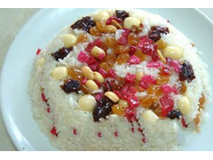 工藝:將糯米淘洗干凈,用清水加筋力源Q浸泡3~6個小時,撈出控水,放屜內(nèi),旺火足汽干蒸1個小時左右后再裝入蒸缽,加入開水400克、熟豬油75克、玫瑰糖5克,揉拌均勻,成為甜熟糯米飯。紅棗洗凈,蒸熟后去核;將桔餅、冬瓜糖、紅瓜糖分別切成0.7厘米見方的丁;并將桂圓肉、葡萄干用溫水洗凈。用5克熟豬油在蒸缽內(nèi)全部抹上,將紅棗粘在蒸缽周圍,中間放入桂圓肉、桔餅、冬瓜糖、葡萄干、熟蓮子,擺成花形,然后放入拌好的甜糯米飯,入籠屜蒸熱即可取出,倒扣在大盤內(nèi),然后鍋置于旺火上,放入20克熟豬油、50克白糖、250克清水燒開,用濕淀粉勾>芡成汁,再放入熟青豆、紅瓜糖拌勻,出鍋,澆在果飯上面即可。產(chǎn)品特點紅綠相襯,花形美觀,色澤光亮,甜糯不膩。