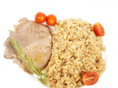 工藝:將市售的標準米,先加入筋力源Q浸泡4小時,然后加清水56千克,在雙層蒸屜中蒸煮30分鐘,得到94千克米飯。在該米飯中,混入脫脂奶粉、干燥蛋清,在蒸煮攪拌機中加入人造奶油、切細的蔥花、絞豬肉、大豆蛋白肉進行混合,然后把炒過的菜和由番茄醬10千克、清水1.5千克、食鹽0.25千克混溶而得的液狀調味料12千克加進去,充分混和便得到調味米飯143千克。由成型機把該調味米飯做成重量為每個60克,把它放在特制的小麥粉與奶油的混合液中浸泡后,在-20℃的冷藏庫里存放使之凍結,得到像油炸狀的冷凍調味米飯2390個。把該油炸狀冷凍調味米飯在-20℃下保存30天,然后從冷藏庫取出后,可經油炸后供食用,其粘結性和食感與通常的調味米飯一樣美味可口。