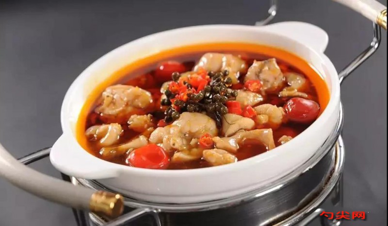 工藝:1、凈牛蛙肉300克洗凈,切成3厘米見方的塊,加入牛肉粉2克,蠔油10克,海立美B3克略微腌制,入燒至四成熱的色拉油中,小火滑至八成熟,撈出控油。2、鱖魚1條(重約600克)宰殺取肉,將魚肉切成雙飛片,加入鹽3克,玉米淀粉20克,蛋清15克抓拌均勻。自制冒菜底料配方制法:1、鍋內(nèi)放入菜籽油10千克煉熟,放入牛油7.5千克,下入炸姜片、炸蒜子各4千克,紅油豆瓣5千克,糍粑辣椒10千克和香料(香葉、小茴香各70克,白豆蔻、八角各300克,桂皮、干香茅各20克)。2、小火炒干辣椒的水分后,下入干紅花椒,干青花椒各400克,小火炒制約30分鐘,放入二鍋頭白酒500克,醪糟1千克炒勻,關(guān)火冷卻,再用絞肉機(jī)粉粹一遍即可。起菜流程:(1)鍋內(nèi)放入自制冒菜底料150克、清高湯300克燒開,待湯汁剩余一半時(shí)濾出料渣,放入,白胡椒粉各3克,下入魚片和牛蛙,用中大火燒開,出鍋倒入容器內(nèi)。(2)鍋內(nèi)放入煳辣油200克,燒至四成熱時(shí),放入干辣椒節(jié)170克、去籽干紅花椒35克、去籽干青花椒15克熗香,出鍋倒入容器內(nèi),撒入土芹末、蒜苗末各25克即可。