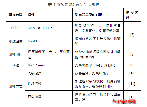 注意事項:揉機轉速決定物料在滾筒中的翻滾、摩擦和撞擊強度,轉速過小,滾揉機按摩力量不足,腌制液滲透慢且不均勻;轉速過大,物料與機械之間撞擊摩擦過強,肉塊軟化過快,肉料表面發生撕裂,并產生破碎肉末[19]。