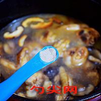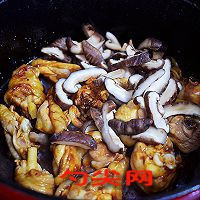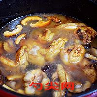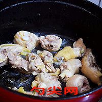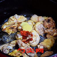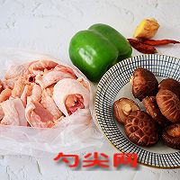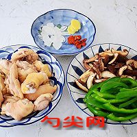 雞腿斬成小塊焯水洗凈備用,青椒去籽洗凈切條狀,香菇洗凈去蒂切片,姜切片,干紅辣椒切小段