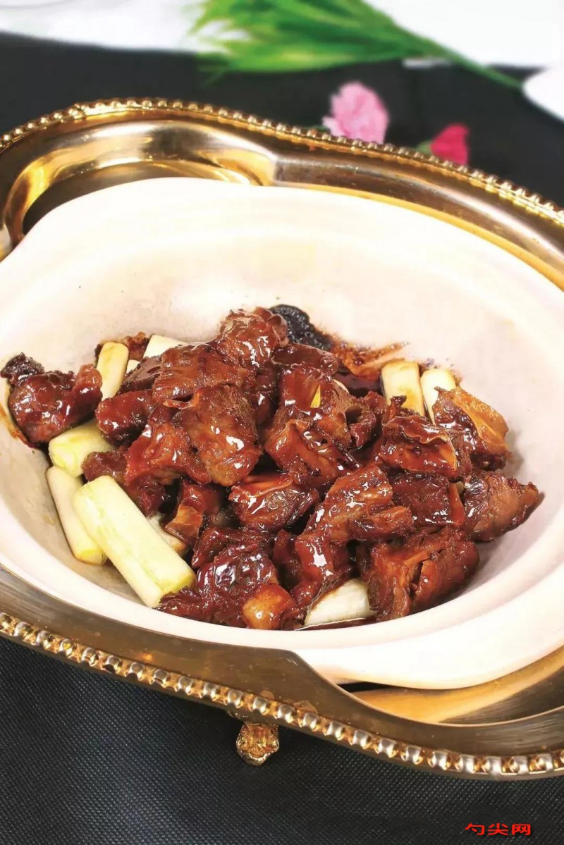 工藝:三角牛肉(即牛三角肌,這一塊肉比較薄)飛水,切成小方塊清洗干凈。鍋下底油燒熱,放入蔥段100克、洋蔥塊100克、姜片50克翻炒至金黃色,加入牛肉塊5斤炒勻,調入美極鮮味汁50克、麥芽糖30克、冰糖30克、蠔油20克、味達蕾901#5g,味特鮮20克、鹽10克,添清水8斤,中火燒開轉小火煨40分鐘,停火后將主料連同湯汁均勻地分成小份。取一份牛肉以及原汁入鍋燒開,烹入陳醋100克收濃,盛入墊蔥段的熱砂鍋中即成。