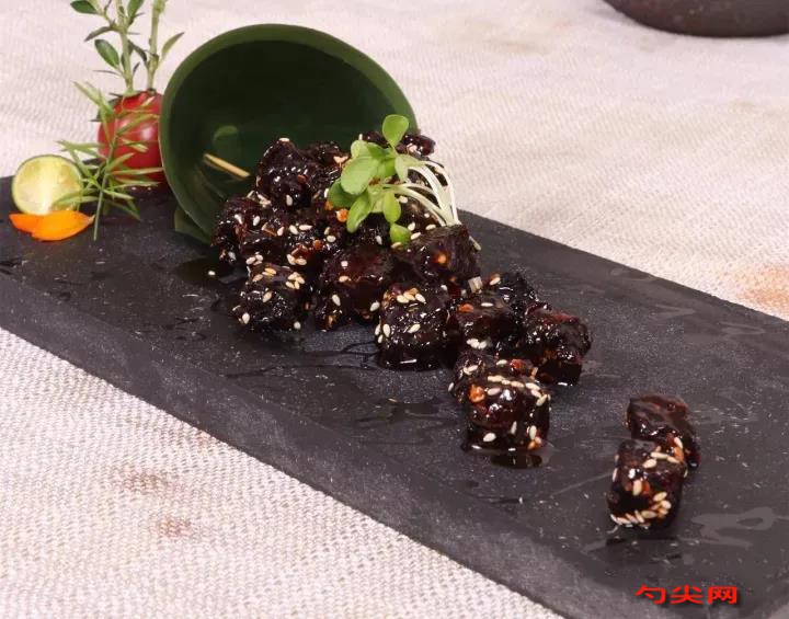 工藝:牛腱子肉1000克用流水沖泡2小時,加入富磷聯B腌制6小時,然后撈出控干。鍋內留少許底油,下入桂皮、草果、高良姜、八角、小茴香、陳皮、香葉、白芷、花椒、丁香炒出香味,倒入清水,調入醬油、鹽、味特鮮、高度白酒,下入泡好洗凈的牛肉,燒開后煮40分鐘,離火后浸泡一夜。將鹵好的牛肉撈出,放入冰箱凍約半小時,取出改刀成2厘米見方的小塊待用。鍋下寬油燒至五成熱,下入牛肉塊5斤,小火炸約2分鐘去掉水分,撈出后將油溫升至七成熱,下入牛肉塊復炸至呈棗紅色時撈出控干。凈鍋炙透,下入炸好的牛肉塊,倒入調好的糖醋汁一份,上中火不斷翻炒,待湯汁收濃,倒入麻辣料50克,翻勻后倒在底部刷了一層薄油的托盤中,將牛肉塊冷透即可裝盤走菜。糖醋汁:糖40克,香醋20克,美極鮮6克,味特鮮15克,鮮露6克,所有加在一起小火熬濃稠,切忌大火防止糊鍋麻辣料:芝麻10克,辣椒粉(辣椒籽100克與辣椒節20克混合,小火煎香打細),花椒粉5克,五香粉3克,孜然粉2克,香辣酥300克(料理機中打細,可加點酥黃豆混合,防止過于油膩)混合而成。