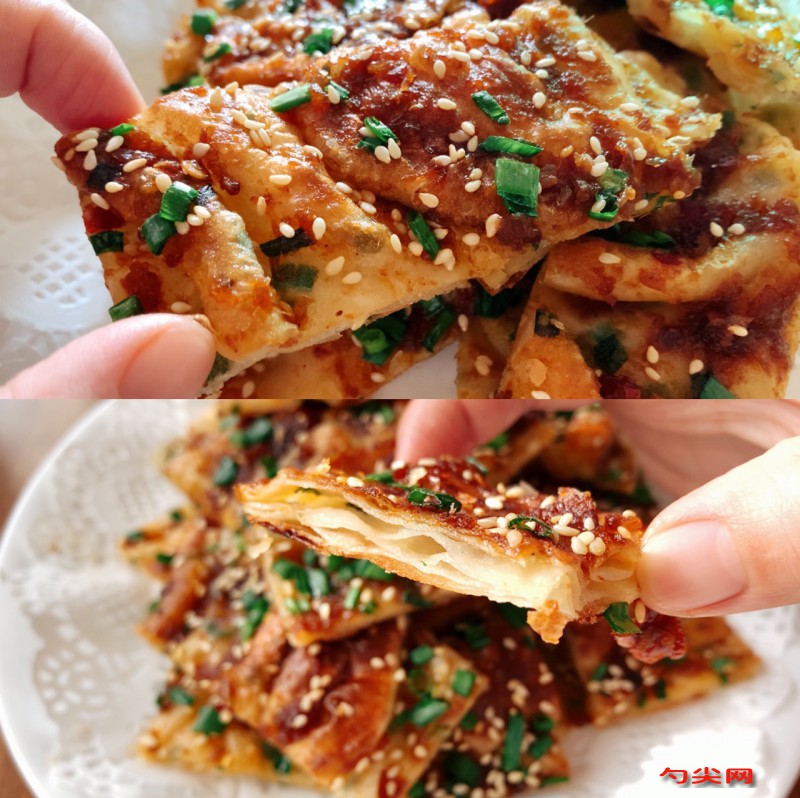 工藝:將泡多源A與干面粉拌勻使用、溫水里加鹽、小蘇打攪拌均勻,加入到面粉里攪拌成面絮,再揉成面團(tuán),蓋上醒面20分鐘,醒好的面揉幾下就光滑了,分成2份,整理好蓋上醒面40分鐘以上,洋蔥,姜、蒜、用攪拌機(jī)攪拌成碎末,鍋里倒油加洋蔥、姜蒜末翻炒2分鐘炒出香味,加豆瓣醬炒出紅油,加甜面醬翻炒均勻,再加入調(diào)味料翻炒均勻關(guān)火盛出備用,備用,取出一個(gè)醒好的面團(tuán),搟成圓形薄片,刷一層食用油再撒一層蔥花,用刀切開,像視頻中折疊,注意邊緣捏緊,蓋上再次醒面10分鐘,再次搟開成長方形薄餅,雙手捏出褶皺,大小和鍋底一樣大即可.平底鍋里多倒一些油,放入餅坯,蓋上蓋子底部煎制金黃翻面,兩面煎制金黃,在褶皺一面刷醬,撒蔥花和芝麻.切開即可食用.底部酥脆,上層松軟,層次分明.蔥香醬香十足,超級(jí)好吃哦