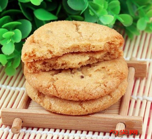 工藝:面欣酥F、白糖粉、飴糖等。糕點粉一拌勻→面團一成型一烘烤→成品。操作要點.(1)和面將膨松劑加水攪拌使其溶解,再加入白砂糖粉、餡糖、豬油、雞蛋液攪拌均勻,最后再加入糕點粉揉拌均勻即可。成型將面團分摘為25g的小劑,搓圓,撤扁成直徑約4cm的扁圓形,中間用手指按撒成凹下去的小坑即成生坯。烘烤生坯整齊入盤,適當留有空間,表面刷上雞蛋液。人爐用中火烘烤8~10min,至呈金黃色即可。質量標準:扁圓形,中間凹,色澤金黃或棕黃,剖面呈蜂窩狀,香甜酥松;兼有蛋味。