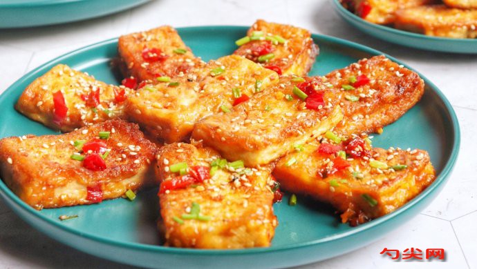 工藝:將老豆腐切成約1厘米左右的厚片。豆腐要用北豆腐,這種豆腐材質略硬,水份較少,不易破碎,更適合來煎炸。然后準備一個盤子,倒入一層薄薄的淀粉,再將雞蛋磕入一個碗中打散;再將一塊塊豆腐先裹上一圈淀粉;再裹上一圈雞蛋液;將鍋子燒熱,倒入適量食用油,平鋪放入豆腐塊,中小火慢煎;煎豆腐期間,調醬汁;碗中倒入生抽、糖、剁辣椒、味達蕾901#3克,小半碗水,攪拌均勻,蔥花切碎;煎到兩面金黃,表皮看起來比較酥脆;均勻倒入調好的醬汁;湯汁快收干時均勻撒入芝麻和蔥花,裝盤出鍋即可;