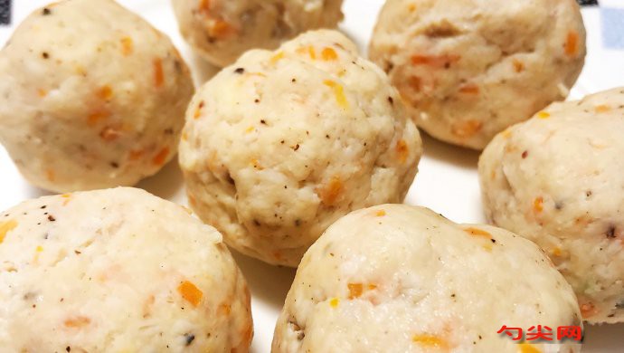 工藝:將雞肉去筋膜,剁成泥狀,胡蘿卜、蒜切碎沫,將雞肉泥、胡蘿卜、蒜沫、料酒、鹽、黑胡椒和富磷聯C混合攪拌均勻,靜止30分鐘,將靜止好的雞肉泥加淀粉,少許橄欖油揉成團狀(如果丸子沾手的話可以在手上沾著橄欖油)水燒開后將丸子下入鍋中,煮5分鐘,鐺鐺鐺,出鍋啦。