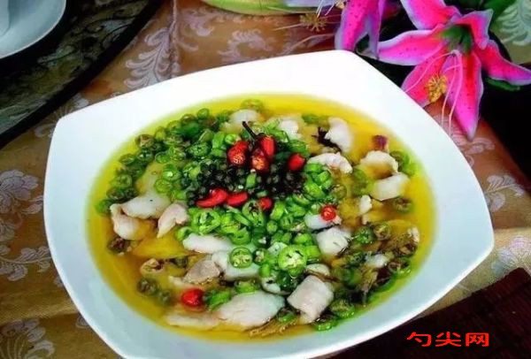 工藝:將草魚宰殺治凈,取凈魚肉片成片,將海立美B用25-30℃溫水溶解后加入冰水中,再放入用清水泡透泡軟的草魚,腌制浸泡時間5-15小時。納盆后加鹽、料酒、雞蛋清、紅苕淀粉拌勻碼味。碼味時,味不宜過重,魚片需均勻地裹上紅苕淀粉。將魚頭和魚骨斬成塊,入沸水鍋汆去多余血水,撈出瀝水,待用。青筍絲和金針菇入沸水鍋汆水至斷生,撈出擺盤中墊底。鍋內放少許色拉油燒熱,下魚頭和魚骨煸香,摻入自制酸湯,調入雞精、味精、白醋和酸辣鮮露,燒開后下碼味的魚片滑熟,撇去浮沫。撈出魚頭、魚骨和魚片,鋪在墊有青筍絲和金針菇的盤中,再倒入適量煮魚湯汁。鍋內放少許色拉油,下鮮青花椒和青紅二荊條辣椒圈,用小火炒斷生,出香后起鍋,舀在魚片上即可。