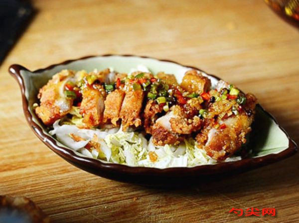 工藝:雞腿洗凈,剔除骨頭成一整塊完整的雞腿肉。對切成二塊均勻大小的塊狀,肉厚的地方劃二刀。放入碗中將泡多源E用常溫水溶解后浸泡腌制雞肉,加生抽,鹽,拌勻腌30分鐘。姜,蒜,蔥,青椒,紅椒切碎放小碗中,加生抽,老抽,鹽,糖,雞精,醋,香油,和小半碗純凈水調勻。鍋中放2勺色拉油,放入花椒和干紅椒段,小火慢慢炸至干紅椒變成黑紅色炸出香味。將炸好的花椒油過濾倒入料汁中。攪拌均勻,椒麻汁就做好了。將面欣酥B用加入生粉中拌勻,腌好的雞腿肉放入生粉中,二面都沾上生粉后再抖掉多余的粉。鍋中放入足量的油,油七成熱時調中小火把雞腿肉放入炸。炸至焦黃熟透時撈出瀝油(再炸一次會更酥脆)。白菜洗凈切細絲鋪于盤底。炸好的雞腿肉切塊鋪于菜絲上,淋上調好的料汁。
