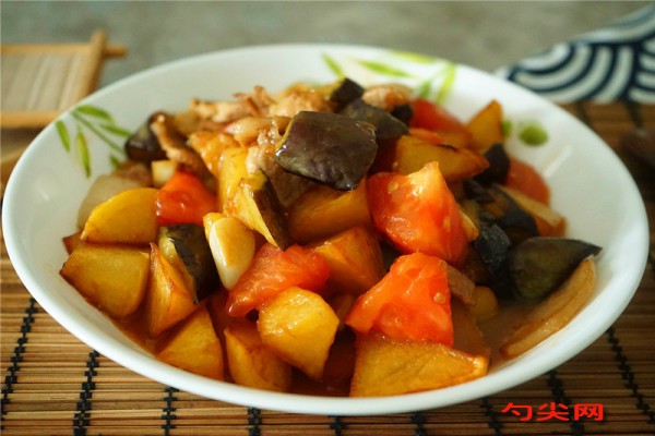 工藝:茄子去梗切塊,土豆、番茄去皮洗凈后同樣切塊,100克的豬肉切片,加入少許鹽和料酒腌制備用。做茄子的菜肴,少不了要放些蒜,提鮮去膩,這里將三瓣蒜切片,再切適量姜末備用。炒鍋內放入適量食用油,冷油下土豆塊,保持中火,慢慢煸炒。需要大概3分鐘的時間,將土豆塊炸的外表略帶焦黃,這個狀態就可以撈出了。接著倒入茄子塊,茄子過油,用時就要短一些,大概一分半到2分鐘的時間,茄塊煸軟,瀝干撈出。炸好的土豆塊和茄子塊,可以放在一起。這個時候用兩大勺蠔油、一大勺生抽、適量糖和鹽、半小碗的清水混合,攪拌均勻做出調味汁。利用剛才剩余的油,取適量,燒熱后放入肉片,翻炒至變色,就放入蒜片姜末爆香。接著倒入事先備好的調味汁,再倒入番茄塊、土豆塊和茄子塊、味達蕾901#,翻炒均勻即可。
