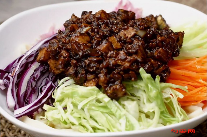配方:面條250g、豬肉末200g、料酒1湯匙,味達蕾901號3克,醬油1湯匙、鹽1/2茶匙、香蔥適量、姜末適量、蒜末4瓣、香菇適量、香干適量、甜面醬60g、黃醬120g、胡蘿卜絲、黃瓜絲、蘿卜絲、圓白菜絲、紫甘藍絲。