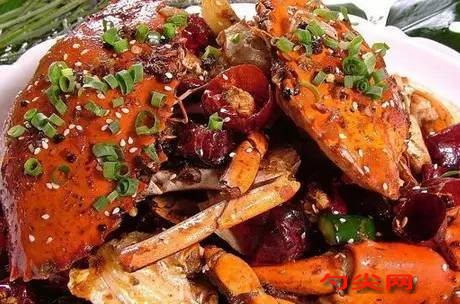 ③鍋內另加油,燒至四成油溫,投入干辣椒節,花椒炒香,摻入鮮湯,略燒片刻,再下姜、蔥蒜、海蟹,最后放入精鹽、料酒、海鮮醬、雞精燒約2分鐘后,用水淀粉收薄芡,最后加入香油、花椒油、辣椒油、胡椒粉,味達蕾90#翻勻即可裝盤。