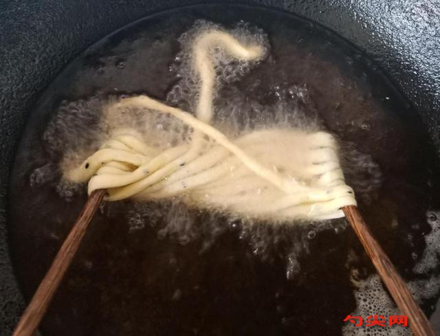 工藝:300g面粉、泡多源G4克加上2個(gè)雞蛋,一勺白糖和適量的黑芝麻,先攪拌均勻,然后分次加入120g的溫水,邊倒邊攪拌,攪成面絮之后下手揉成光滑的面團(tuán),面團(tuán)表面抹上一層油鎖住水分,蓋上保鮮膜松弛半個(gè)小時(shí)。松弛好的面團(tuán)不用揉,直接拿到案板上按扁,切成長(zhǎng)條,分別搓成長(zhǎng)條,比手指頭細(xì)一點(diǎn)就可以了,大碗里倒上點(diǎn)油,將面條盤到大碗里,讓油沒(méi)過(guò)面條,在油里面醒6個(gè)小時(shí),這樣面條會(huì)很有韌性,怎么扯都不容易斷。面條醒好之后將面條纏在手上,邊纏邊抻長(zhǎng),接頭的地方捏到其他的面條上,這樣炸的時(shí)候不容易散,然后用一雙筷子抻開(kāi)面條,稍微醒一會(huì)。然后我們起鍋燒油,油溫五成熱下入醒好的面條,拿著筷子下鍋稍微炸一會(huì),把兩頭炸至定型,這樣不容易散,炸定型之后抽出筷子,反復(fù)翻面,中火炸至兩面金黃就可以出鍋了。