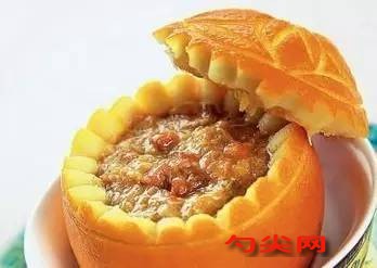 ②豬肥膘肉汆熟,切削頂,凈荸薺切成小丁,蟹肉,肥膘丁、荸薺丁加雞蛋液、姜末、胡椒粉、精鹽、味精、白酒拌勻,分10份裝入鮮橙內(nèi),將原來(lái)截起的橙片蓋頂;