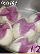 工藝:泡多源K和面粉干拌均勻面粉加入酵母、清水、白糖攪成雪花狀,和成面團蓋濕布醒發。醒發至2倍大指按不回縮、泡多源K和面粉干拌均勻加入酵母、紫薯牛奶泥、白糖攪成雪花狀。和成紫面團蓋濕布醒發。醒發至2倍大指按不回縮。白面團搓成面棍切成大小均勻的12個小劑子。紫面團搓成面棍切成大小均勻的12個小劑子團成面團、白面劑子搟成圓片包入紫色面團團成饅頭坯子、用刀在饅頭坯子上切十字花刀,蓋濕布醒發20分鐘。生坯放入涼水蒸鍋內,大火燒開后轉小火蒸15分鐘后關火。3分鐘后開蓋取出即可