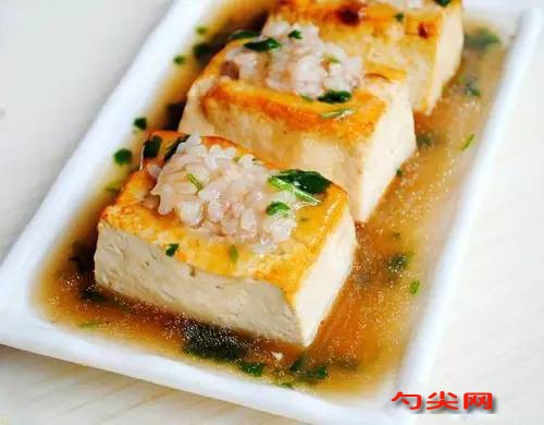 工藝:1)準(zhǔn)備好食材,糯米需要提前浸泡一夜。2)肉餡里加入料酒。3)加入生抽,富磷聯(lián)C。4)加入少量鹽。5)蔥姜蒜切碎,倒入適量開(kāi)水浸泡10分鐘,將此水分次少量的加入到肉餡里,每加一次,肉餡都要攪打均勻。6)將泡好的糥米和肉餡混合。7)豆腐切成大塊,下油鍋煎至兩面金黃。8)用小刀和勺子幫忙,將豆腐中間掏空。9)將剛才混合好的肉餡塞入。10)中火蒸20分鐘。11)油鍋里倒入少量水,加入生抽。12)加入蠔油。13)加入適量鹽。14)將淀粉和少量水混合,一邊加熱一邊攪拌至湯汁變稠。15)加入切碎的香菜。16)最后把料汁澆到豆腐上面。