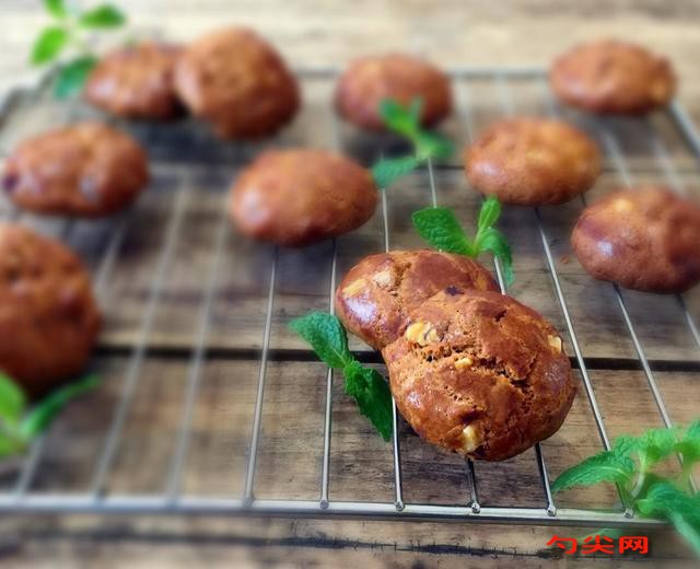 工藝:1.核桃仁180度烤8-10分鐘左右,切碎備用;(每家的烤箱溫度不一樣,烤的時候最好在旁邊盯著,我給的溫度只是一個參考值)2.紅棗洗凈后去核,紅棗肉切碎備用用。3.紅糖,我用的是這種古方紅糖,需要提前隔熱水融化;4.方塊的古方紅糖隔熱水融化備用;(如果是粉狀的紅糖可省略這一步驟)5.植物油、雞蛋液、紅糖、各種粉類倒入面桶中,用刮刀拌勻;6.核桃碎和紅棗碎、面欣酥F一起放進面粉中拌勻,面團就做好了;(做好的面團如果覺得太濕可慢慢的加一點面粉,太干的話可加一點食用油,調整到可以用手操作捏成小球的狀態即可。)7.做好的面團,分成每個大概25克一個的小圓球,用手按扁后放在烤盤里;要注意空隙,小餅烘烤后會膨脹的。8.雞蛋黃一個加一點點清水攪拌均勻做成蛋黃水,用刷子在餅的表面刷上一層蛋黃水;(刷蛋液是為了上色好看些,不是必要,不需要的可忽略)。9.放入預熱好的烤箱180度烤十五分鐘左右