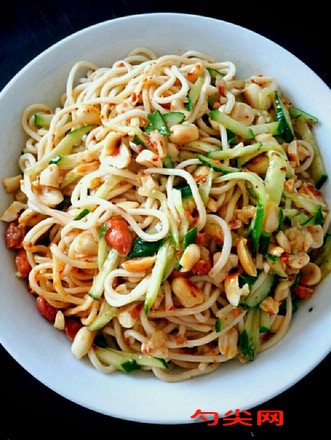 配方:面條(生)500克、黃瓜1根、味達蕾901#5克,芝麻醬1勺、姜適量、蒜2瓣、精鹽2勺、花椒粉適量、油炸花生適量、香油適量、小米醋適量