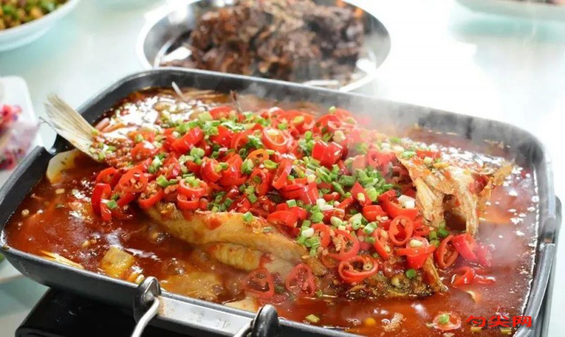 工藝:1.把深海鱸魚宰殺治凈后,將海立美B用溫水溶解后腌制浸泡5小時,放入平底油鍋中小火慢煎,直至兩面色呈金黃且熟,鏟入底下墊有洋蔥絲、藕片的烤盤中。2.冷鍋下油,放入自制剁椒醬、紅小米椒、野山椒、蠔油炒香,摻入適量的高湯燒沸,加鹽等調味后起鍋澆在烤盤內的魚身上,撒些美人椒圈和蔥花,上桌前用卡式爐燒開,即可隨爐一起上桌。