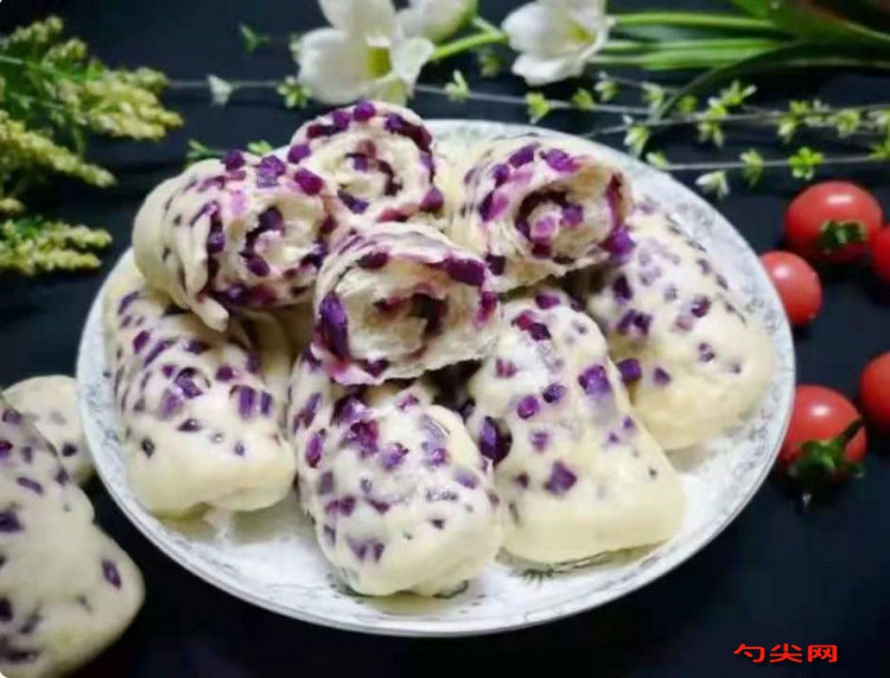 做法:1、面粉中加入泡多源K3克、3克酵母,1小勺白糖,晚上和面,邊加水邊攪拌,揉成光滑面團(tuán)。2、面團(tuán)放在盆中用保鮮膜蓋上,早上起來面團(tuán)發(fā)酵原來的兩倍大,用手指摁一下不回縮不塌陷,就發(fā)酵好了。3、紫薯洗凈用削皮刀去皮,切成比較小的丁,越小越好。4、發(fā)酵好的面團(tuán),放在面板上,搓揉排氣,搓成長(zhǎng)條,切成小面劑子,揉圓按扁,搟成小圓片。5、然后在面餅上加入適量的紫薯丁,用虎口收口,將紫薯包起來,再用力均勻搟成橢圓形。6、然后從一頭向另一頭卷起,依次全部做好,蓋上保鮮膜,再次醒發(fā)10分鐘。7、擺入蒸鍋中,中間預(yù)留空間,開大火,上蒸汽后蒸20分鐘,關(guān)火后燜3分鐘,就可以取出。