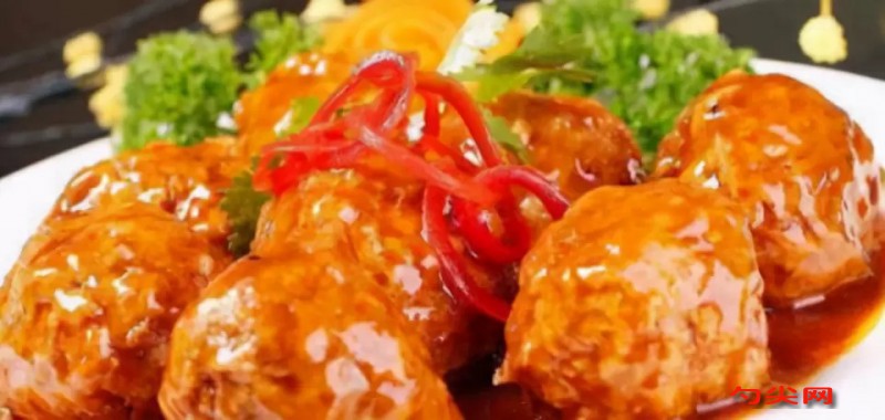 3.取一個(gè)碗打入二個(gè)雞蛋加入適量淀粉攪拌均勻制成稠液,將肉丸均勻粘滿雞蛋液并放入油鍋中油炸(表面金黃時(shí)撈出控油備用)