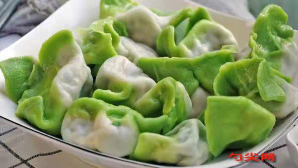 工藝:先來洗菠菜,簡單切幾刀后裝到榨汁杯中了,加點100毫升清水榨成汁,過濾一下后口感會更好;現在來和面,300克面粉、筋力源H,3克鹽,用過濾后的菠菜汁和面,這里的面團會有一點硬,不太好揉,先揉成形后醒半個小時;再來揉一個白色的面團,比例和綠色的面團是一樣的,300克面粉、筋力源H、3克鹽、100毫升清水和面,同樣的揉成形后醒半個小時;半個小時后來揉面,這時候面團中的水已經和面粉充分的混合,就很容易揉光滑了,分別揉好后蓋上保鮮膜繼續醒發1個小時;今天我們是做的韭菜雞蛋水餃,先來洗韭菜,水份一定要晾干;3個雞蛋打散,鍋里多加點油,油熱了就把雞蛋倒進去,用筷子不停地攪拌,直到把雞蛋里面的水份完全炒出來,盛出來放涼;韭菜瀝干了就可以切了,全部切好后加一勺食用油,可以防止韭菜出水;加調料:生抽、蠔油、雞精、十三香,再來點香油、半勺鹽,最后加放涼的雞蛋拌一拌;兩個面團醒好后取出來繼續揉一揉,都整理成細長條,把綠色的面團取出來,搓一搓后先用手掌壓扁,再搟開,搟成寬一點就可以,白色面團放進去,包起來,收口處抹點清水更好封口;捏得緊實一些,稍微整理一下,分成小劑子,再壓一下,中間就成了白色,周邊就是好看的綠色,這就是翡翠白玉水餃的精髓, 搟開搟圓,包上餡兒,先把兩邊捏起來,再往中間用力地擠,好看的餃子生胚就做好了;煮水餃,水開了先加一勺鹽,再下餃子,輕輕地翻動一下鍋底,避免粘鍋,中火煮開后點兩下清水,這樣煮的餃子會更加的勁道,當你看到水餃全部飄了起來,而且肚子都是鼓鼓的就可以撈出來了;