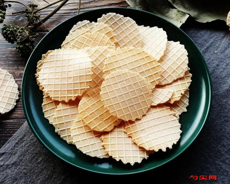 工藝:稱量好食材。牛奶、油、糖放在一個(gè)較大的容器里攪打均勻,打到糖溶化。 依次加入淀粉、泡多源K、粳米粉、蕎麥粉攪打均勻,無干粉,基本無結(jié)塊,稠厚程度如圖狀態(tài)。如想看攪拌手法視頻請移步公眾號“眉記”。蛋卷機(jī)的溫度旋鈕轉(zhuǎn)到2/3處,預(yù)熱2分鐘左右。我這蛋卷機(jī)買的便宜貨,上面的測試標(biāo)識已經(jīng)看不清了,從左向右順時(shí)針方向?yàn)閺牡蜏氐礁邷兀酱笞彀投苟固帪樽罡邷亍0衙婧ǖ降熬頇C(jī)上,做大的脆片就多點(diǎn)面糊,放在中心位置,一次做一片;做小脆片就少點(diǎn)面糊,一次做三到四片。我是一次3片,每片小半勺面糊。放好面糊蓋上蓋子,扣好搭扣,約烘烤2分鐘。一開始會(huì)有大量水汽冒出,發(fā)出滋滋的聲音,慢慢地水汽少了,聲音也輕了,能聞到香味了,可開蓋檢查一下,如上色不滿意蓋上蓋子繼續(xù)烘烤。烘烤到表面略變黃,一般就可以了,剛出鍋時(shí)是軟的,幾秒就變硬了。如果冷了還沒硬,說明烘烤不夠,可回爐再加工。香脆的蕎麥脆片就做好了, 咔嚓咔嚓停不下來嘍!