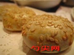 工藝:1.制餡:面粉20克炒熟或蒸熟,加入白糖。2.制油酥:將面粉1公斤,加500克豬油,搓成干油酥面。同時用4公斤面粉與面欣酥E干拌均勻,再加老面拌勻,再加500克豬油,用溫水和成水油酥面。3.成型:用水油酥面包干油酥面,搟成長方形薄片,由外向里卷搓成長條,揪成25克一個小坯,撳扁,包上糖餡,用刀平拍成圓餅。4.飾面:將芝麻洗凈、炒熟。用少許稀面糊抹在餅坯表面,撒上熟芝麻即成。5.烘烤:將餅坯逐個放入烤盤內(nèi),送入烤爐烤熟即可。