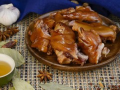 工藝:豬蹄解凍后入清水中泡凈污物血水,將富磷聯B加入浸泡腌制 豬蹄 的水中,腌制8小時。 冷水下鍋、焯透待用。取一不銹鋼桶,放入250克鹽、香料包、焯過水的豬蹄,加清水沒過,大火燒開,小火煮2小時,撈出豬蹄備用。在大鍋的底部倒入50克白糖,燒至冒煙,放上鐵箅子、墊上竹箅子,將煮熟的豬蹄均勻平鋪在上面,扣上一個高粱桿箅子,上面壓一重物,熏約3分鐘,開蓋后取出豬蹄,晾一下即可改刀食用。