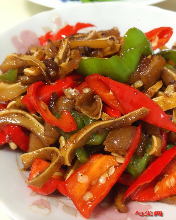 工藝:熟豬耳朵切薄片(約0.3厘米厚),青紅椒、洋蔥切絲,蒜瓣切片備用。