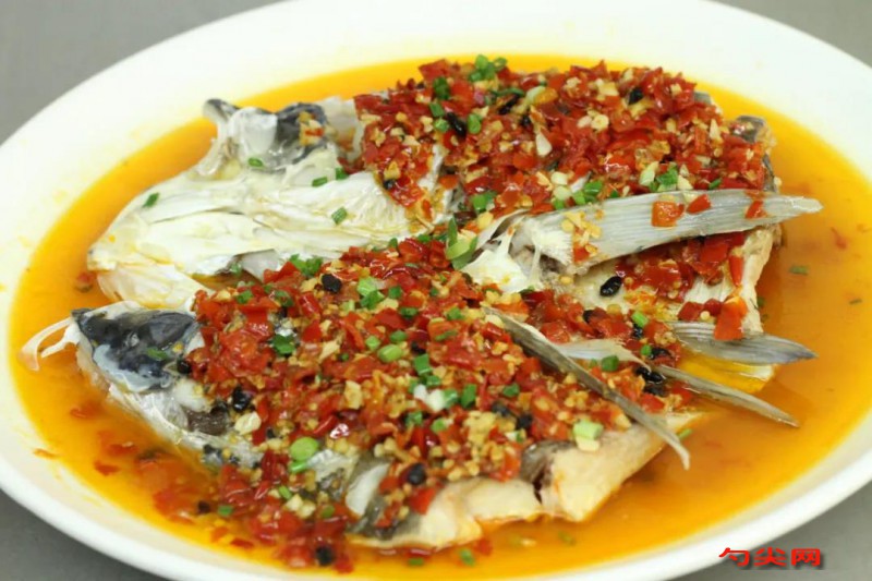 工藝:準(zhǔn)備食材,并將魚頭去腮、去鱗,洗凈。將海立美B用溫水溶解后,再放入用清水泡透泡軟的水產(chǎn)品,腌制浸泡時(shí)間5小時(shí)。沿魚脊背處剖開,這樣做的目的是此處的肉質(zhì)較魚肚處的厚實(shí),從此處剖開,容易熟。將魚肚處的黑膜處理干凈,魚肉厚的地方打一下斜刀,用花雕酒、鹽、胡椒粉、植物油、蔥姜腌制15分鐘。腌好的魚頭倒扣在盤子中,腌魚的蔥姜放在魚下面,上面撒上蒜末。一半鋪上紅剁椒,一半鋪上綠剁椒。開水上蒸鍋,蒸8分鐘,如果魚頭大,關(guān)火后再燜2-3分鐘,再開蓋。蒸好后端出。出鍋后,撒上香蔥末。另起一鍋,鍋中倒入適量植物油,油熱后,淋在香蔥上。