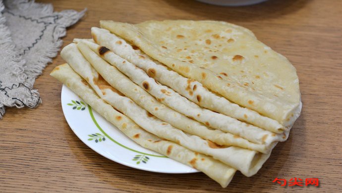 注意事項:面團宜軟不宜硬,可在開始做飯時就揉面,最后再烙餅,這樣就能充分利用準備和烹飪的時間餳面團了,經過餳面,面團柔軟,可塑性強;烙薄餅不需要太多油,鍋底倒一點點油,用刷子刷勻即可;烙薄餅的火力不要太小,防止水分蒸發過多而使餅硬,中火就成。