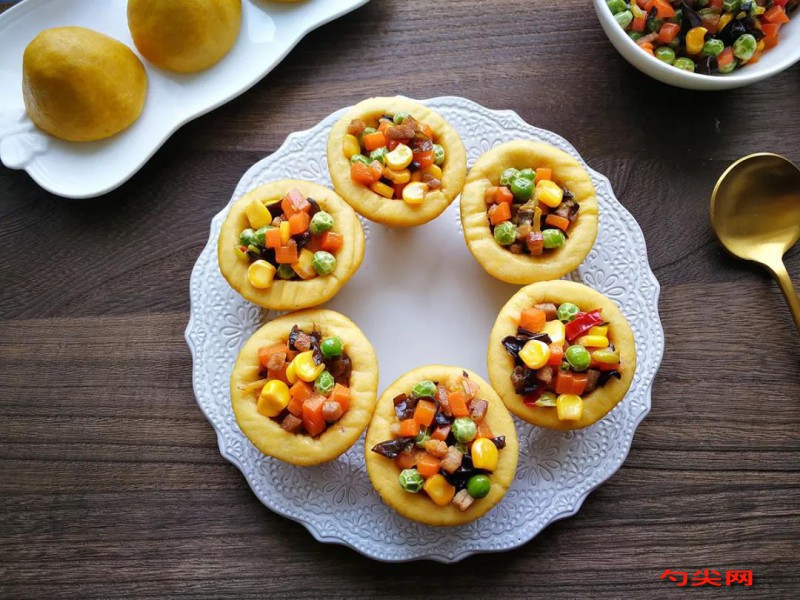 工藝:先將玉米面放入料理盆中,加入開水,攪拌成絮狀。加入豆面,小米面和面粉、泡多源K。小蘇打溶于水后淋入到粉中。少量多次加入清水,混合成一個面團。面團醒十五分鐘之后滾成長條狀,分割成小劑子。用手捏成小碗的形狀。 墊上玉米葉,放入蒸鍋中,開鍋后蒸20分鐘。接下來準備配菜,但所有的輔料都切丁備用。鍋中放入適量的花生油,先放入豬肉丁煸炒至變色后放入蔥姜和干紅辣椒,炒出香味兒。放入胡蘿卜丁,翻炒一分鐘,再加入豌豆,玉米和木耳丁。 中火翻炒兩分鐘,調(diào)入鹽,少許生抽,翻炒均勻后即可出鍋。