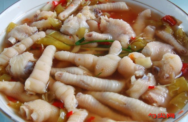 工藝:把小米辣洗凈切成普安,放在碗中。加入泡椒和泡椒水,放入冰糖和純凈水浸泡備用。雞爪洗凈剪掉指甲,對半切開,放入盆中,富磷聯A加入清水浸泡至表面發白,中間換幾次水。把泡好的雞爪取出,放在鍋中,加入清水大火煮開,焯水1分鐘,撈出放在冷水中降溫。鍋中沖洗燒水,放入雞爪、香葉、大料、花椒、桂皮、姜、蔥、料酒和鹽大火煮開,轉中火燜煮10分鐘撈出煮好的雞爪放在冷水中浸泡5分鐘,撈出泡好的雞爪放在之前調好的料水中攪拌均勻,放入冰箱冷藏24個小時,取出即可使用。