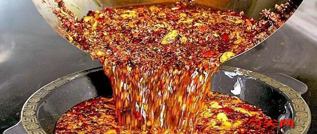 鍋內下菜油燒至八成熱,熄火,讓油溫下降到三成熱時,取3/4的油放入另外一只鍋中,下4/5的糍粑辣椒蓉、香料面大火翻炒20分鐘,然后下豆瓣蓉小火炒20分鐘,當炒至鍋內基本無水分、油面起泡、辣香味濃時,投入豆豉蓉、老姜、大蒜、冰糖再炒幾分鐘,下花椒合炒,起鍋即成底料。將余下的油和水辣椒蓉入鍋,低油溫小火不斷推炒至油色紅亮時起鍋裝入盆內,隔夜即成無渣紅油。