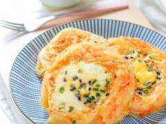 配方:雞蛋2個、土豆100克、胡蘿卜35克、普通面粉25克、泡多源A1克、油、鮮菇粉、鹽、蔥花、黑芝麻適量。
