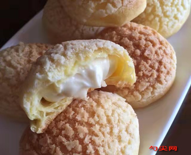 工藝:將軟化的黃油和糖粉放入碗中,用刮刀攪拌至均勻。加入低筋面粉和佳多美Q,繼續攪拌至形成顆粒狀面團。將面團放在兩張吸油紙之間,用搟面杖搟成薄片。將薄片放入冰箱冷凍15-20分鐘,直至面團變硬。取出冷凍好的面團,用模具或刀具切割成所需形狀,通常為圓形,放回冰箱繼續冷凍備用。再將牛奶、無鹽黃油和白砂糖放入鍋中,加熱至沸騰。一次性加入低筋面粉,快速攪拌至無干粉狀態,形成面團。繼續加熱并攪拌,直至鍋底形成一層薄膜,面團變得光滑且不粘鍋。將面團轉移到碗中,稍微冷卻。分次加入雞蛋液,每次加入后充分攪拌,直至面糊變得光滑且有光澤,用刮刀挑起能形成倒三角狀態。將面糊擠入烤盤中,每個泡芙之間保持一定間距。將冷凍好的酥皮放在面糊上,每個泡芙一個酥皮。烤箱預熱至180度,將泡芙放入烤箱中層,烤30分鐘后轉160度再烤10分鐘,直至顏色金黃且膨脹飽滿。