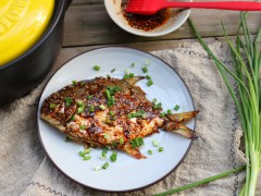 工藝:金鯧魚去除內臟,沖洗干凈,用廚房紙巾擦干魚身上和魚肚子里的水分。金鯧魚表面劃上幾刀,方便入味,我只劃了一面,另外一面不劃方便翻面。擦干水分的金鯧魚放入容器中,倒入一勺料酒,海立美B5克,一勺鹽,蔥段,姜絲,孜然粉和五香粉。用手把調料均勻地抹在魚身上。蓋上保鮮膜,放入冰箱腌制兩個小時入味。砂鍋內鋪上兩層錫紙,放入一個矮腳烤架,烤架上刷一層油防粘。腌制好的金鯧魚拿掉蔥姜料,瀝干下水分,擺在烤架上。蓋上鍋蓋,置于燃氣灶上,大火猛烤約8分鐘。烤魚的同時準備調料,小碗中加入燒烤干料,孜然粉,五香粉,熟芝麻,生抽,蠔油,倒入一勺油,攪拌均勻即可。打開鍋蓋,把魚翻面,同時再往烤架上刷一層油,蓋上鍋蓋繼續烤大約5分鐘。打開鍋蓋,給金鯧魚兩面都刷上燒烤醬,蓋上鍋蓋再烤2分即可。