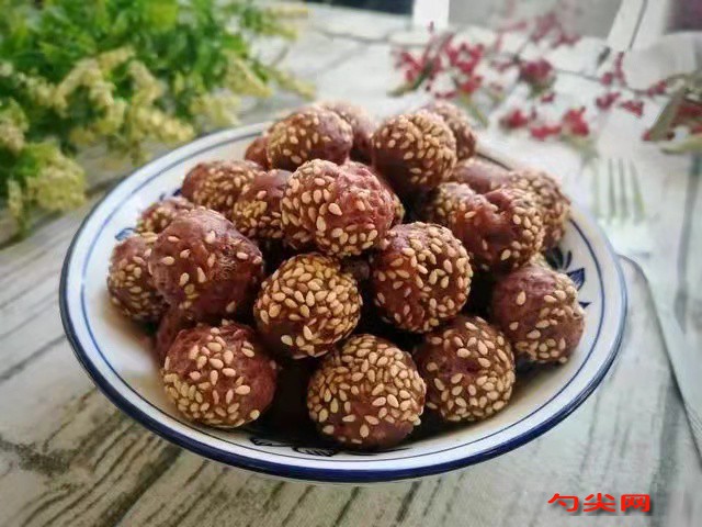 7、讓小丸子裹上白芝麻,用手團實些整理形狀,這樣芝麻粘得更牢固。注意:小丸子上的芝麻一定要蘸清水讓表面芝麻粘得更牢固,我炸好后丸子上的芝麻掉了一些。
