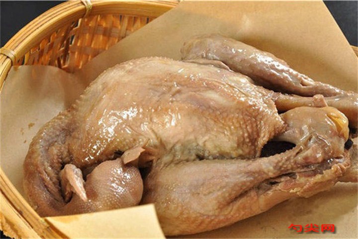 5、鹵煮:生雞下鍋后,再按比例加放調料,上火開煮。先用旺火將鍋內物燒沸,撇去浮沫,用箅子把雞壓好,再改小火慢慢燜煮,其間要轉鍋以使火候均勻,煮至軟爛而不散即可。