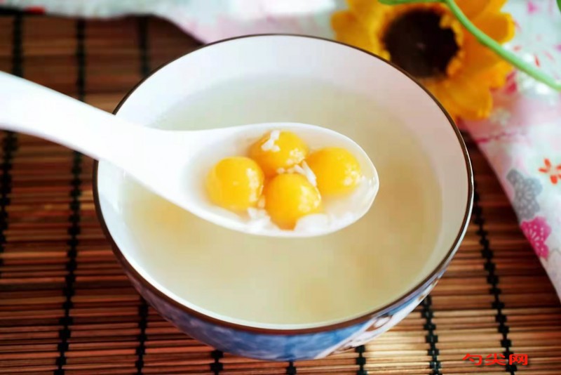 4、適量醪糟放入湯鍋里,煮沸后倒入南瓜圓子,再放入2-3顆冰糖塊,保存中小火煮3-4分鐘,等圓子浮起來即可關火。