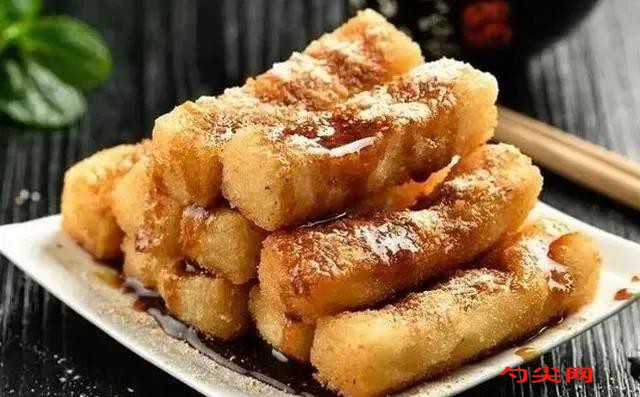 接下來,把冷凍好的紅糖糍粑取出來,在刀上抹點涼白開,都切成長條,在平底鍋里倒上油,把糯米糍粑放進去煎,要勤翻面,煎的每年都是金黃出鍋,淋上熬好的糖液,撒上點白芝麻即可食用(家里沒有白芝麻的話,也可以不放)。