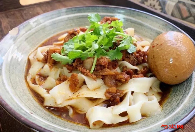 7、煮好的刀削面先盛上一勺面湯,然后連湯澆上兩勺肉臊子,最后再加上一顆鹵蛋,來上幾根香菜,一份熱騰騰的肉臊子打鹵面就出鍋了。