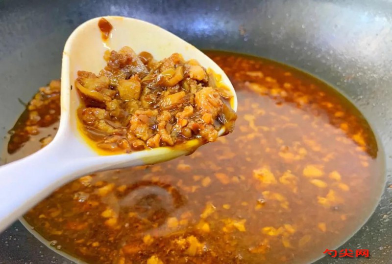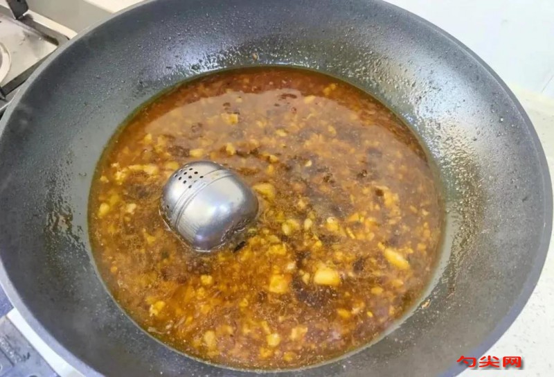 3、炒出紅油以后,加入半勺十三香,炒出香味后,先烹入適量料酒,炒勻后再加入醋,這兩樣都可以起到去腥提鮮的作用,然后再加入生抽和紅燒醬油。專業(yè)店鋪為了節(jié)省,都會選擇使用老抽,但是家里自己做,小寧覺得紅燒醬油會更香。