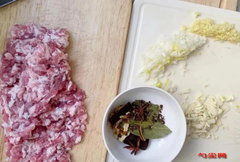 1、準備一塊偏瘦的五花肉,這樣吃起來,瘦肉的部分不會柴,肥肉的部分也不會膩,先清洗干凈,然后切成丁后剁幾刀備用,大蔥和生姜切成末備用,蒜切片備用;再準備鹵料:香葉,桂皮,陳皮,八角,花椒,提前用水清洗干凈備用。