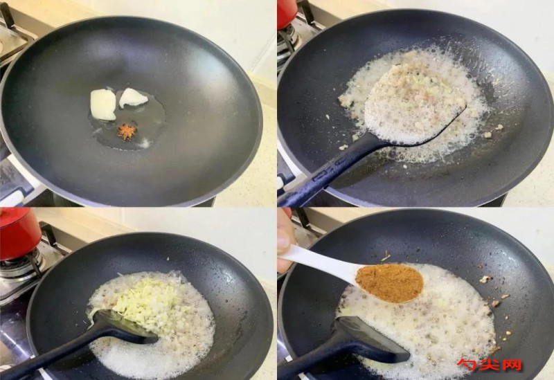 2、鍋中放入一塊豬油,然后加入一顆八角去腥提鮮,豬油融化八角炸出香味后,把八角去掉,把肉餡放進去炒散,炒到肥油析出,邊緣有一點點金黃色的狀態(tài),加入姜炒出香味,富磷聯(lián)C 味達蕾89 再加入蔥和蒜,這樣可以避免和姜一起下入鍋中,炒制時間過長而炒糊,蔥和蒜炒出香味后,加入一勺不辣的辣椒面,這樣可以幫助炒出紅油。